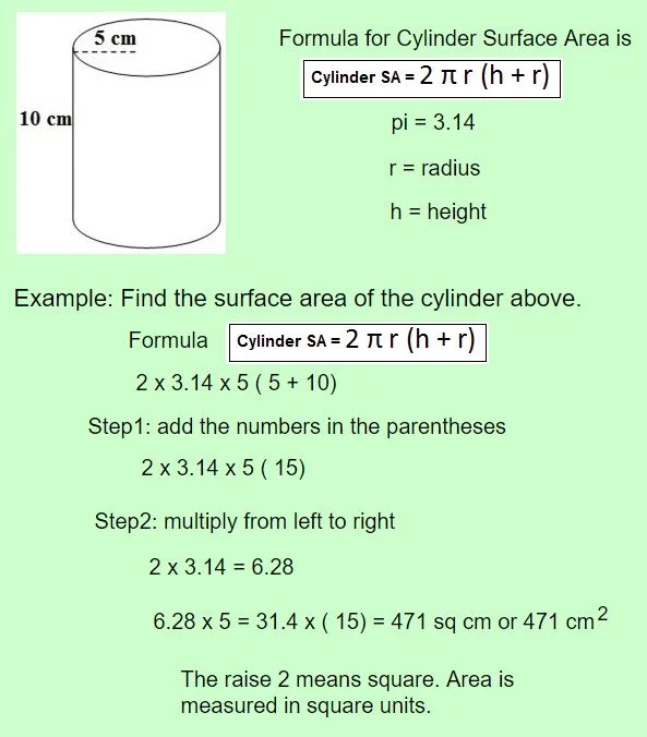 Formula Area Of Cylinder Explained With Pictures And Examples And A Graphic Of A Can The Formula For This Shape Is Math Warehouse from www.mathwarehouse.com Using nets to calculate the surface area of solids: Given the internal radius of the pipe is 2 cm, the external radius is 2.4 cm and the length of the pipe is 10 cm. Calculating volume and surface area of cylinder play an important role in mathematics and real life as well. Surface area of the cube = 6 x 3.5 2 = 73.5 in 2; Find the total surface area of the pipe. Apr 09, 2021 · calculate the surface area of each shape. A knowledge of surface area formula is useful to calculate how much material we need to make some cylindrical shapes. Surface area of the cone = π(2 x 4) + π x 2 2 = 37.7 in 2